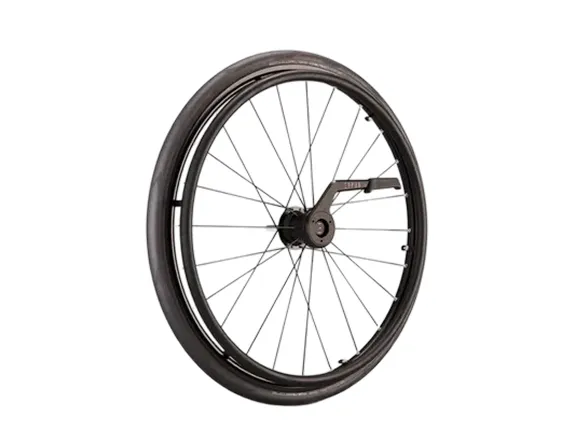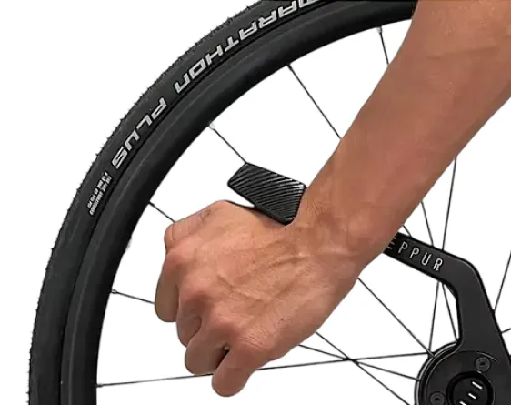 A diferencia de los sistemas tradicionales, en los que el frenado se realiza directamente en los aros, Skeed introduce una palanca de accionamiento que activa un mecanismo de pinza interno para frenar en el cubo de la rueda. Con un peso de tan solo 2,15 kg por rueda en su configuración estándar (incluido el aro de empuje de aluminio), Skeed hace que los cambios de ruedas sean mucho más fáciles y reduce significativamente el peso total de tu silla de ruedas.